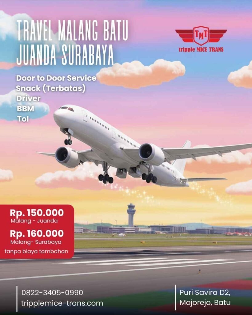 Untuk rute Malang / Batu / Surabaya → Bandara Juanda, tersedia layanan travel dengan harga Rp150.000 per orang, sudah termasuk penjemputan door to door, armada AC yang bersih dan nyaman, serta driver profesional yang memahami rute dan waktu aman menuju Juanda, termasuk untuk penerbangan subuh dan malam hari.